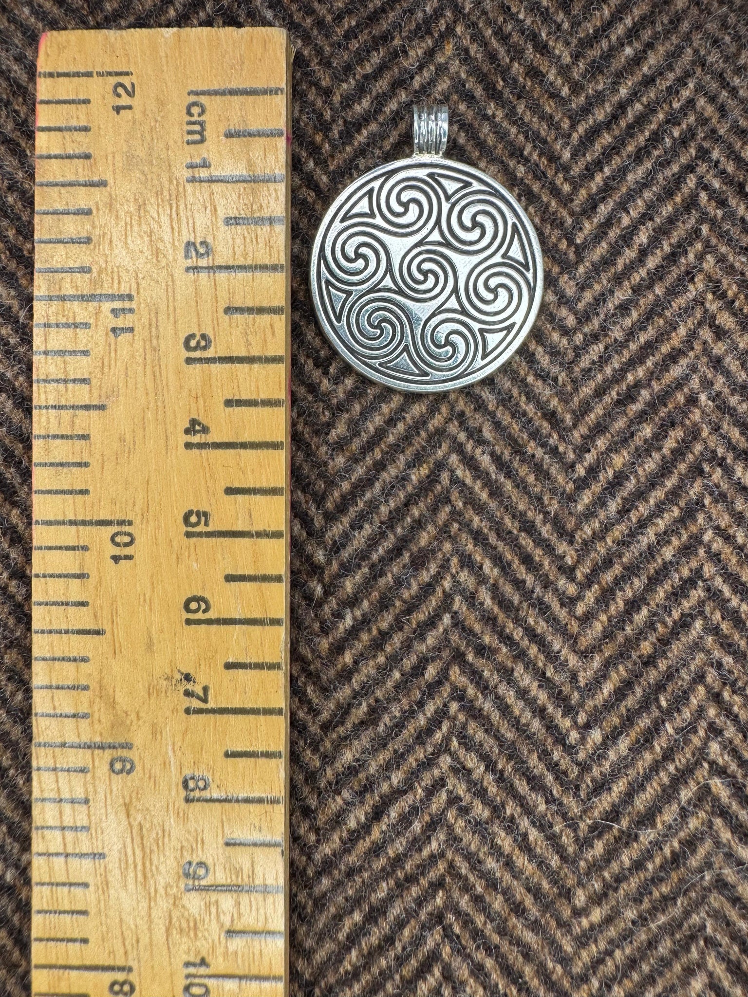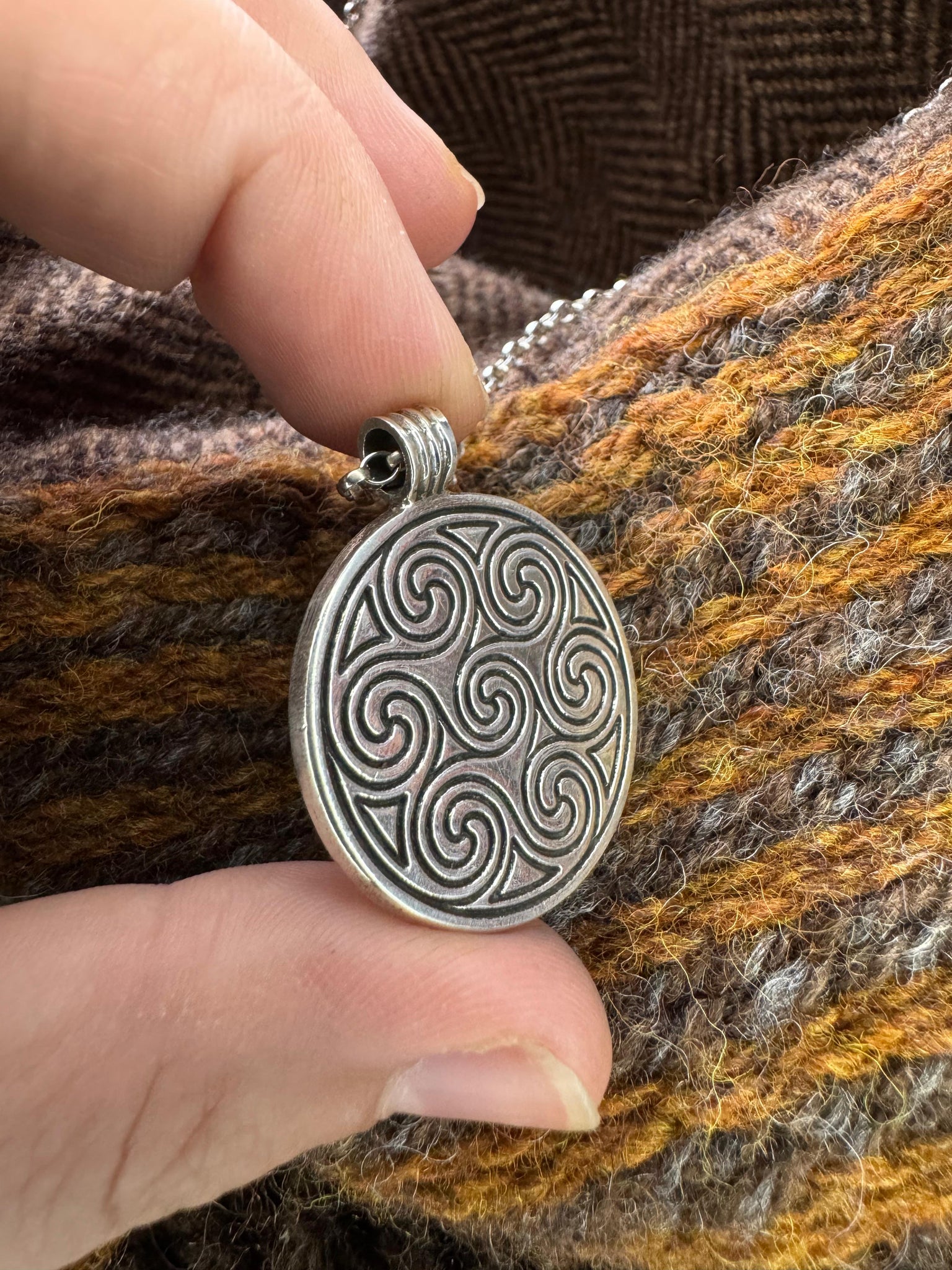 There are five significant standing stones with Pictish carvings in Aberlemno. This pendant is based on a swirl pattern carved into Aberlemno 2, a huge stone in the kirkyard.