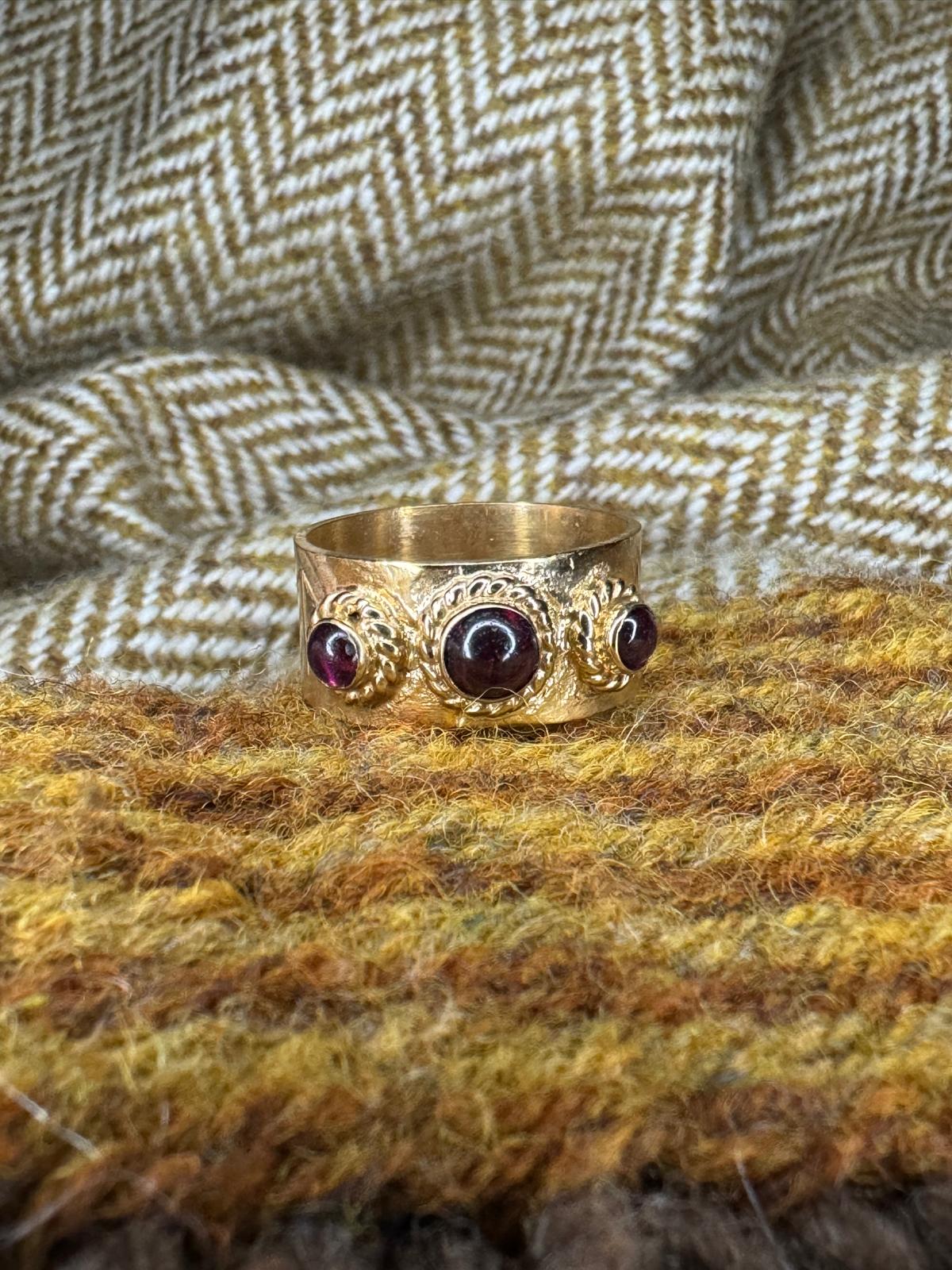 Made from hand rolled silver sheet and set with 3 garnet cabochons based on an Anglo Saxon ring from Wheatley Hill. The hand engraved Runes say "Ring Ic Hatt" which translates to "I am called Ring". Gold Plated.